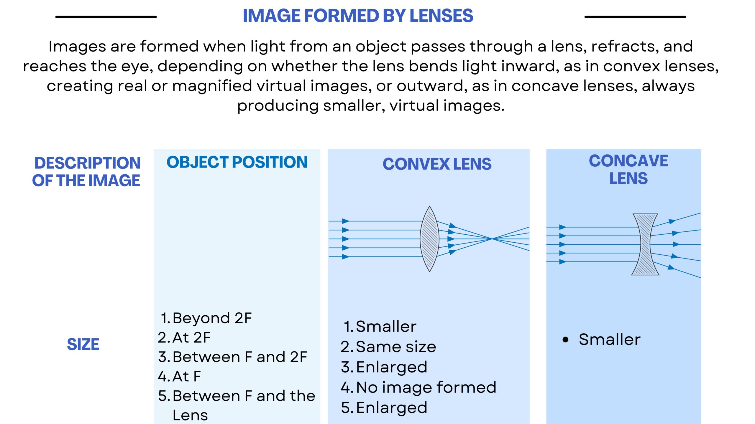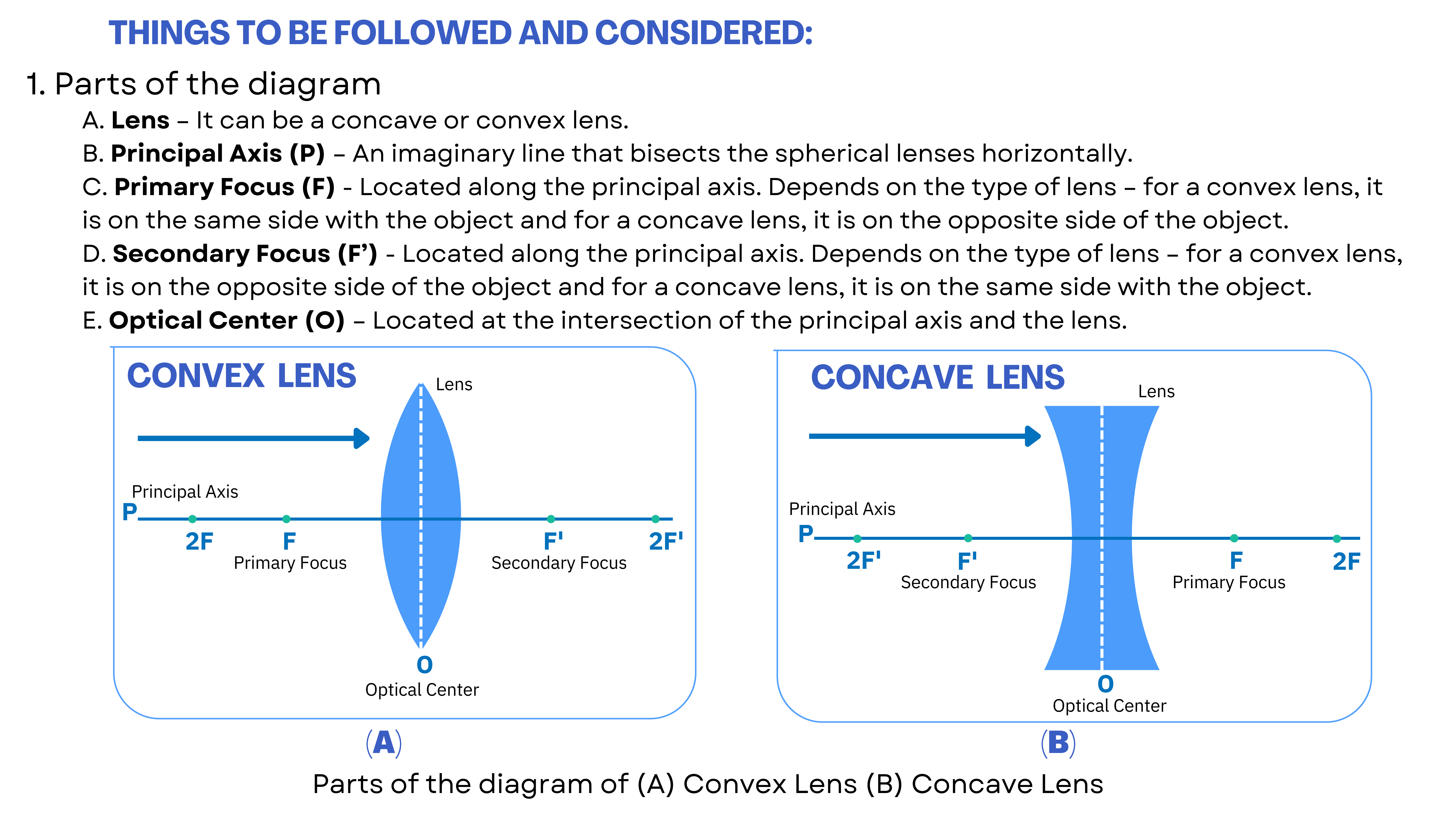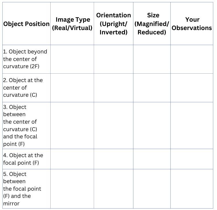 Record Your Observations: After each adjustment of the object, record the image characteristics in the table provided below. For each position, note the type, orientation, and size of the image.